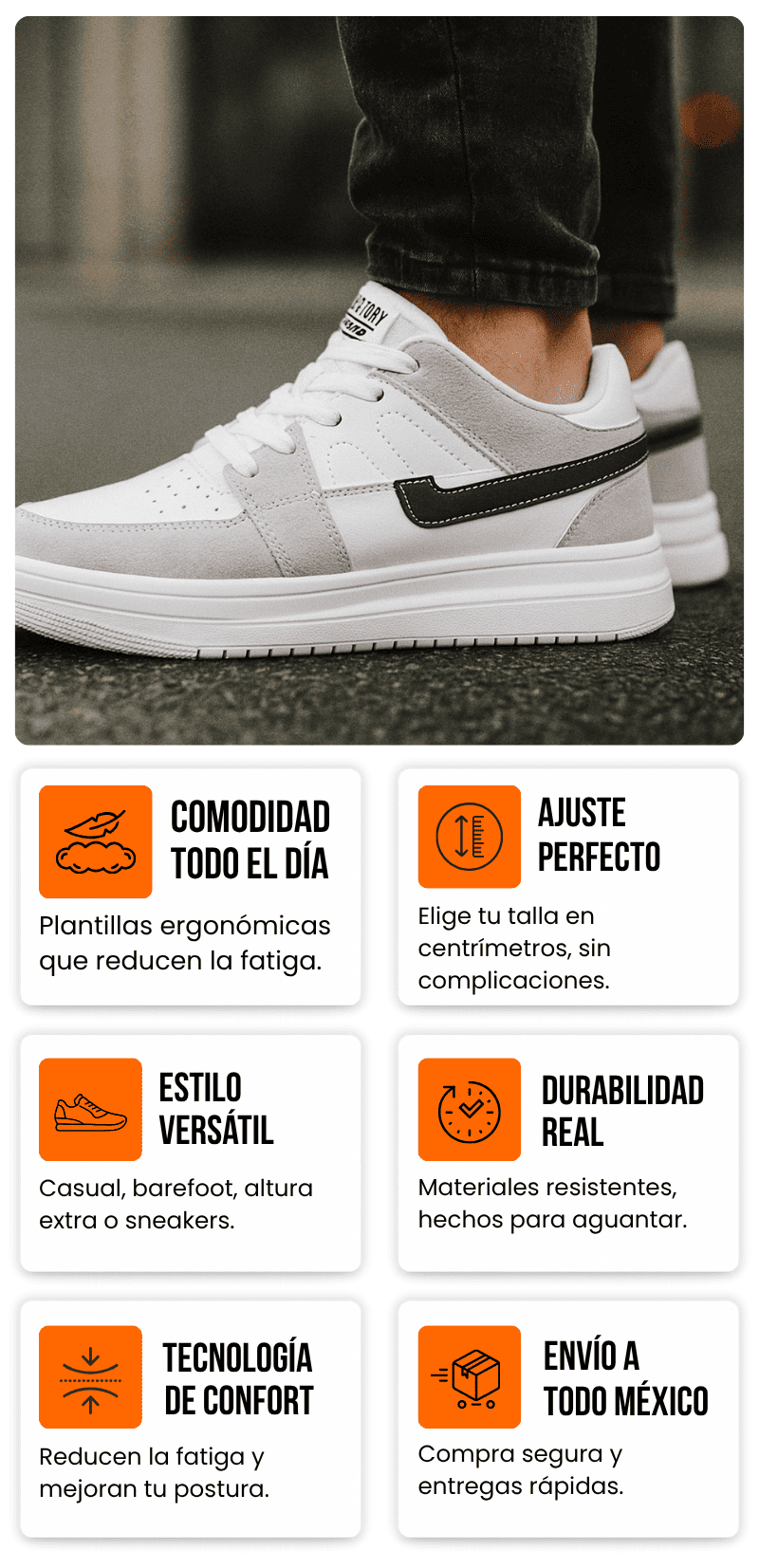 La calidad es excelente: materiales resistentes y diseño versátil. Las uso tanto para caminar como en la oficina y siempre se sienten cómodas. El detalle de altura extra me da confianza sin que nadie lo note.