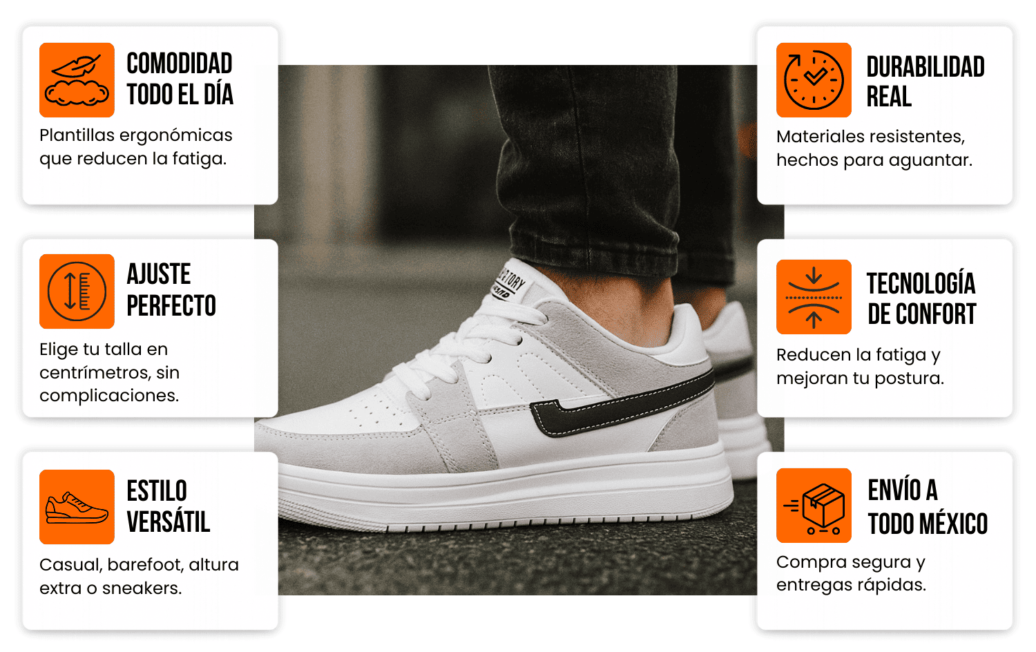 Nuestro calzado combina diseño, comodidad y tecnología. Contamos con modelos barefoot que te hacen sentir como si caminaras descalzo y modelos de altura extra que suman centímetros sin perder confort. Además, usamos materiales ligeros y resistentes pensados para el ritmo de vida en México.