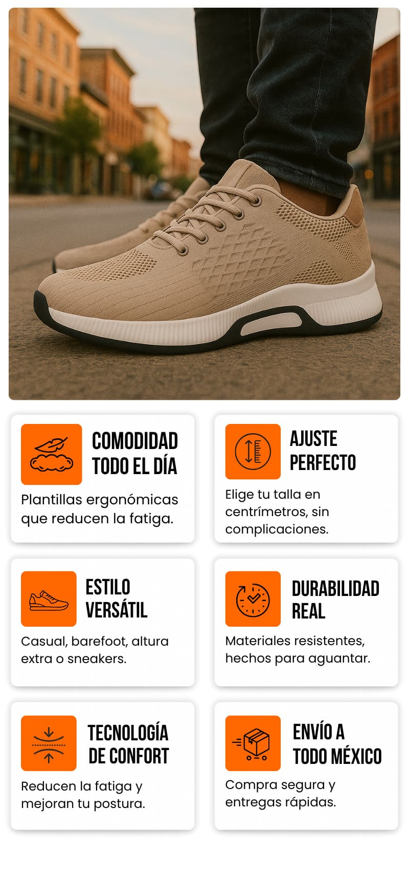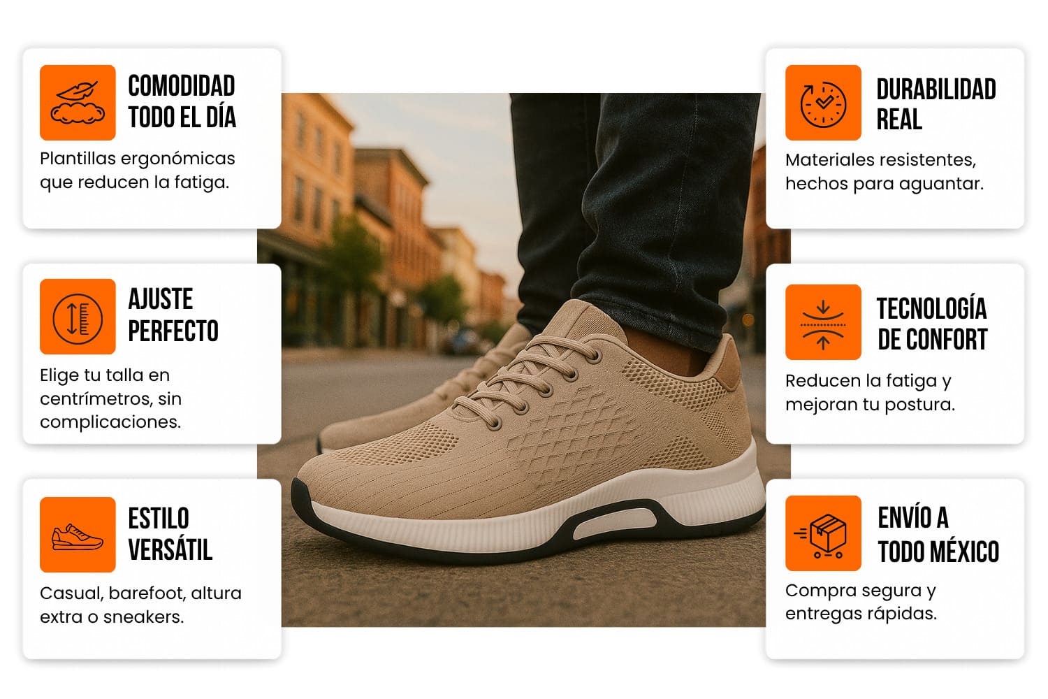 Nuestro calzado combina diseño, comodidad y tecnología. Contamos con modelos barefoot que te hacen sentir como si caminaras descalzo y modelos de altura extra que suman centímetros sin perder confort. Además, usamos materiales ligeros y resistentes pensados para el ritmo de vida en México.